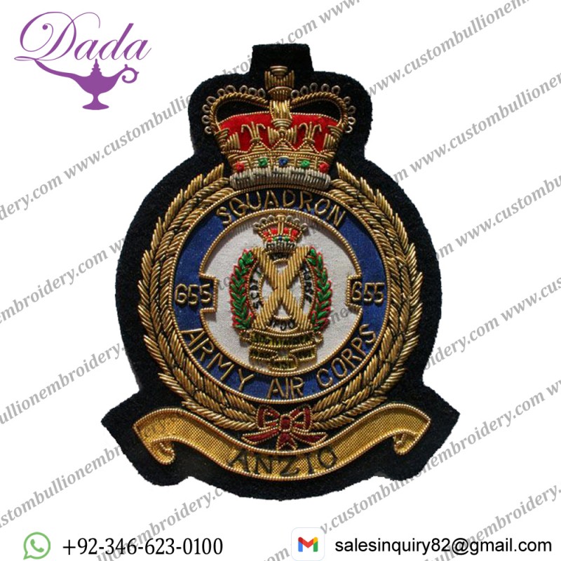 Army Air Corps Blazer Badge, 655 Squadron, Wire Are The Ultimate Emblems. At Custom Bullion Embroidery, We Are Proud To Say Our Expert Craftsmen Make Each One Individually. We Combine Gold and Silver Bullion wire Thread With Hand-stitched Embroidery to Produce a Beautiful, Classic Look.