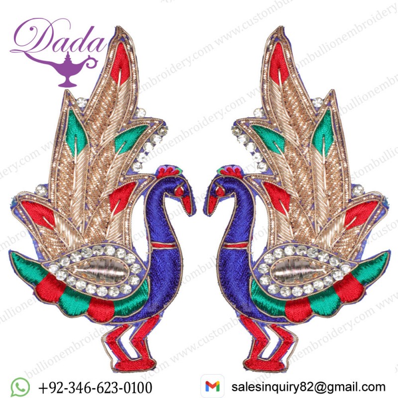 Pair of Zardozi Peacock Patches with Embellished Crystals also known as