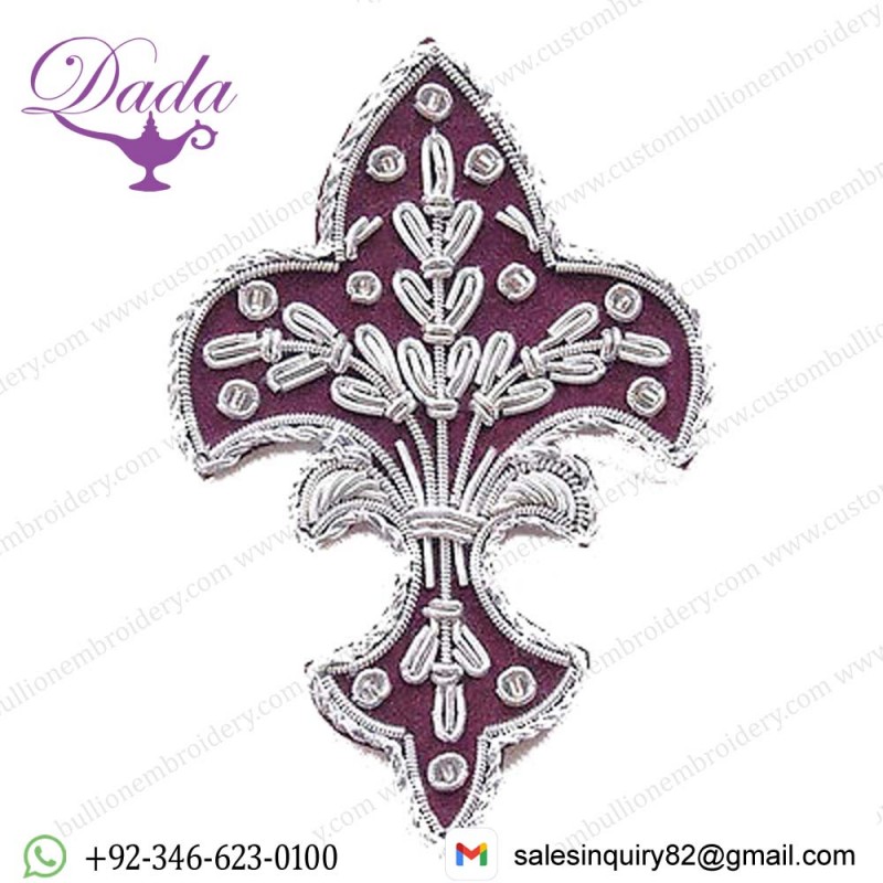 4 Hand-Embroidered Appliques. Fleur De Lis. Burgundy with Silver BullionUsage For garments, bags, home decoration,shoes, promotional, jacket,
