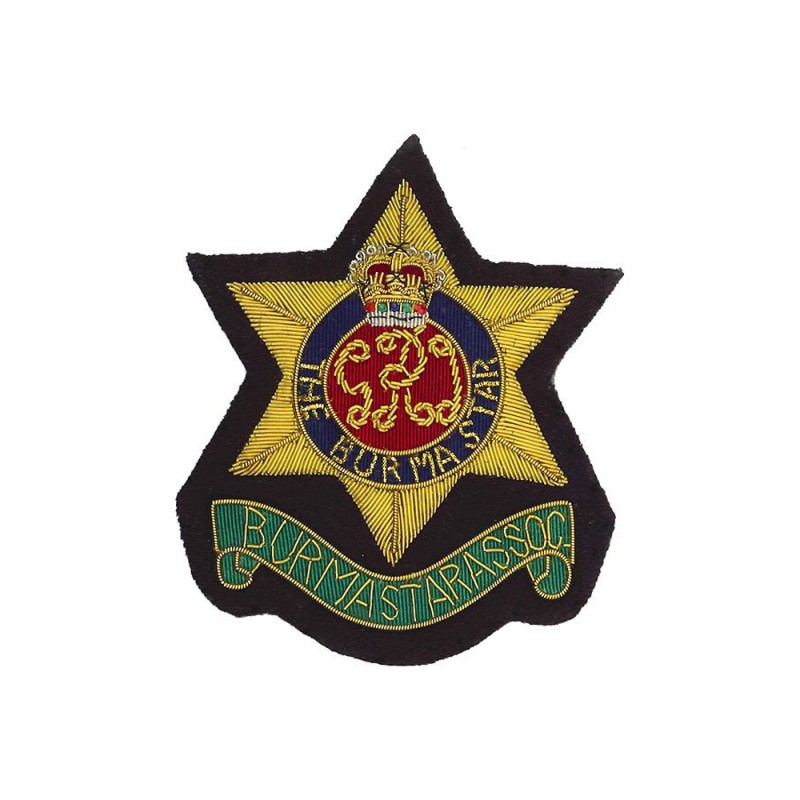 Blazer Badge Cap Badge Burma Star Association Officer Uniform Bullion Embroidery Burma Regiment Bullion Wire Badges, Burma Bullion Badges, Overseas Military Regiment Hand Embroidery Badges, Civilian Regiment Hand Embroidered Badges, Burma Regiment Bullion Badges, Overseas Military And Civilian Badges, Bullion Wire Cap Badges,