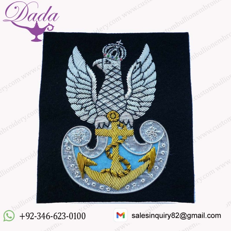 POLISH NAVY BLAZER BADGE Are The Ultimate Emblems. At Custom Bullion Embroidery, We Are Proud To Say Our Expert Craftsmen Make Each One Individually. We Combine Gold and Silver Bullion wire Thread With Hand-stitched Embroidery to Produce a Beautiful, Classic Look.