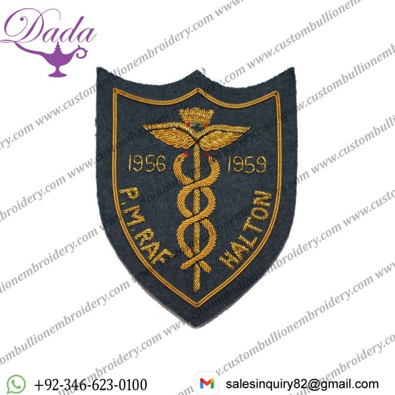 Royal Air Force Blazer Badge, Halton Hospital 1956-1959, Wire Are The Ultimate Emblems. At Custom Bullion Embroidery, We Are Proud To Say Our Expert Craftsmen Make Each One Individually. We Combine Gold and Silver Bullion wire Thread With Hand-stitched Embroidery to Produce a Beautiful, Classic Look.