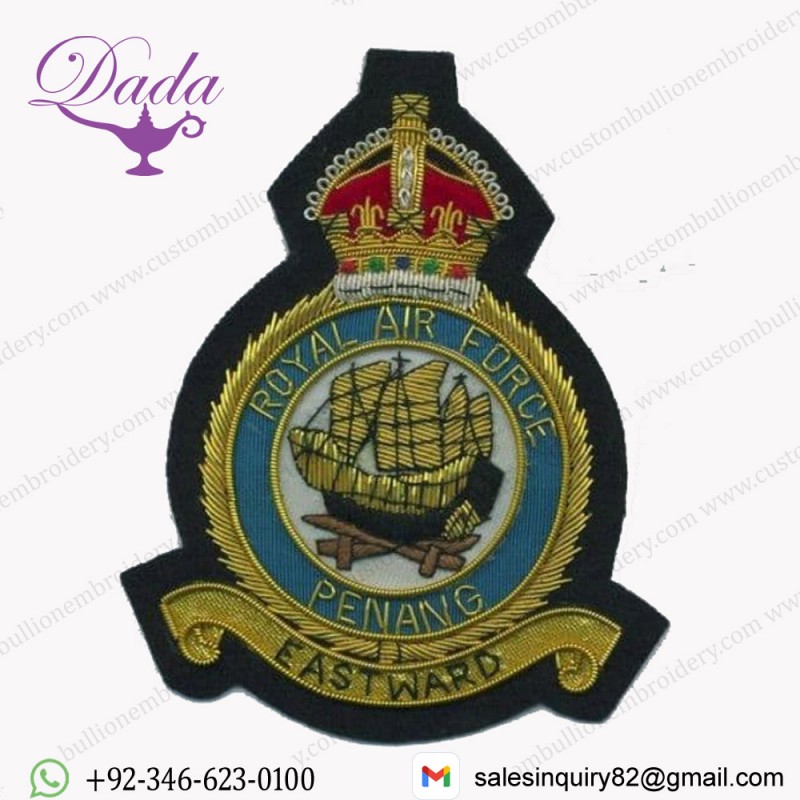Penang Royal Air Force RAF Station Base GOLD WIRED Blazer Embroidered Badge Are The Ultimate Emblems. At Custom Bullion Embroidery, We Are Proud To Say Our Expert Craftsmen Make Each One Individually. We Combine Gold and Silver Bullion wire Thread With Hand-stitched Embroidery to Produce a Beautiful, Classic Look.