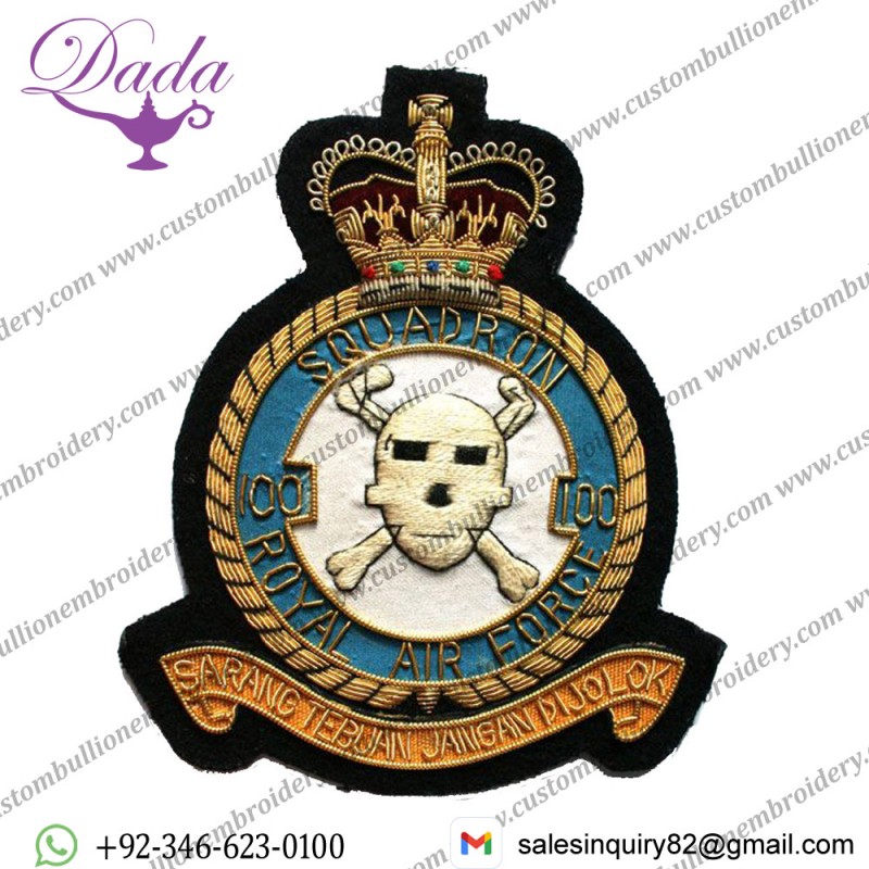 Royal Air Force Squadron Wire Blazer Badge, Gold Bullion Wire Patches Supplier, Squadron Blazer Badges, Regiment Hand Embroidered Gold And Silver Bullion Wire Badges, Squadron Wire Blazer Badge, Embroidered Bullion Wire Cap Badges, Squadron Bullion And Wire Blazer Badge,